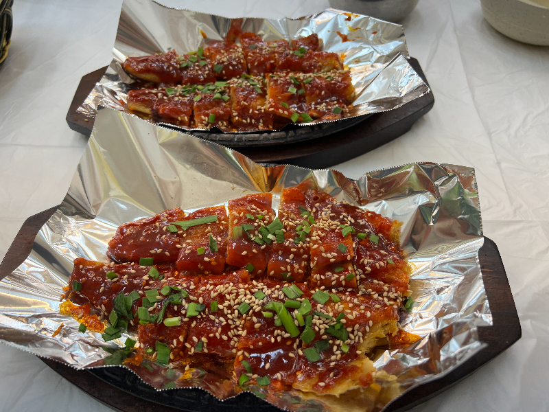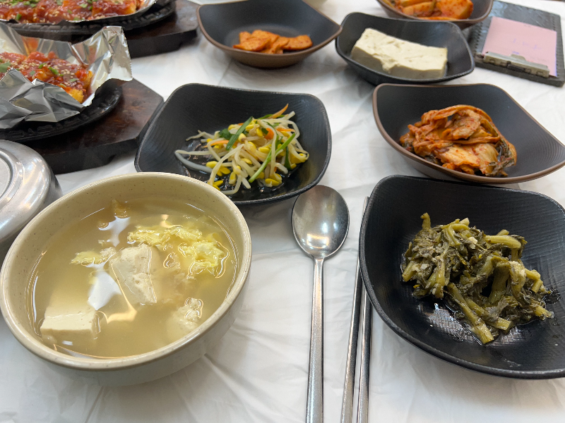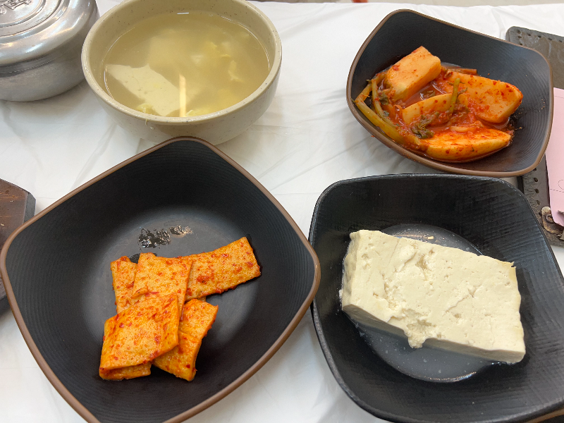 반찬은 쌈배추, 쌈장, 김치, 파김치, 총각무 김치, 두부, 볶음김치, 콩나물 무침, 어묵볶음, 밥식혜?, 시래기 무침?.
