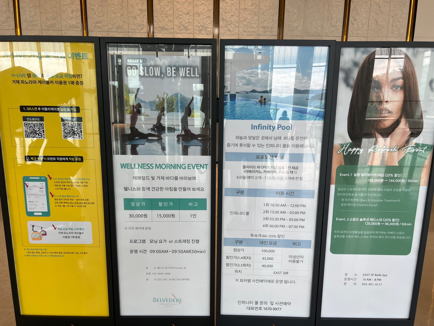 모닝 요가, 인피니티 풀, 벨 스파에 관한 요금과 기타 안내사항 등이 적혀 있어요.