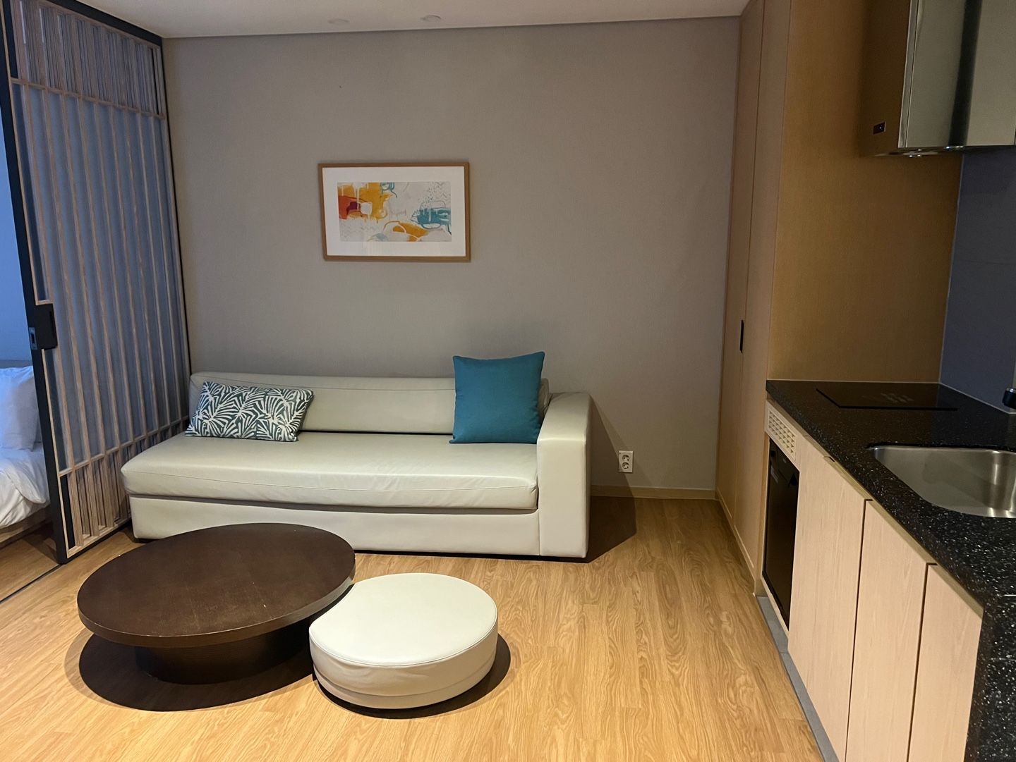 밤에 호호네와 8명이서 이곳에서 먹고 놀았는데 어른들은 큰 테이블에 둘러앉아 음식을 먹고, 둥근 소파카우치를 테이블 대용으로 아이들 4명이 둘러앉았는데 그렇게 좁다고 느껴지진 않았어요.