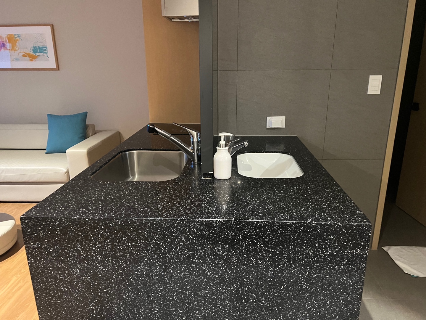 취사는 불가하지만 간단한 설거지 등을 할 수 있는 싱크대가 있고, 그 뒤로 손을 씻을 수 있는 세면대가 있어요.