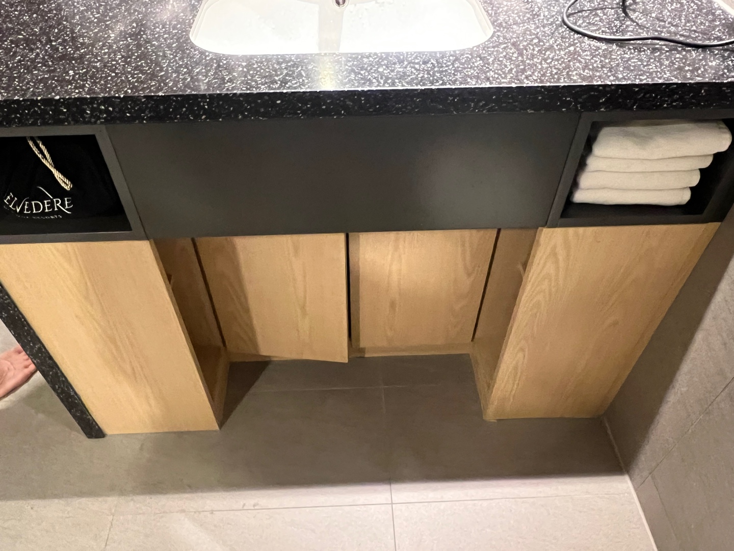 세면대 밑 왼편에 드라이기, 오른편에 타월이 있어요.