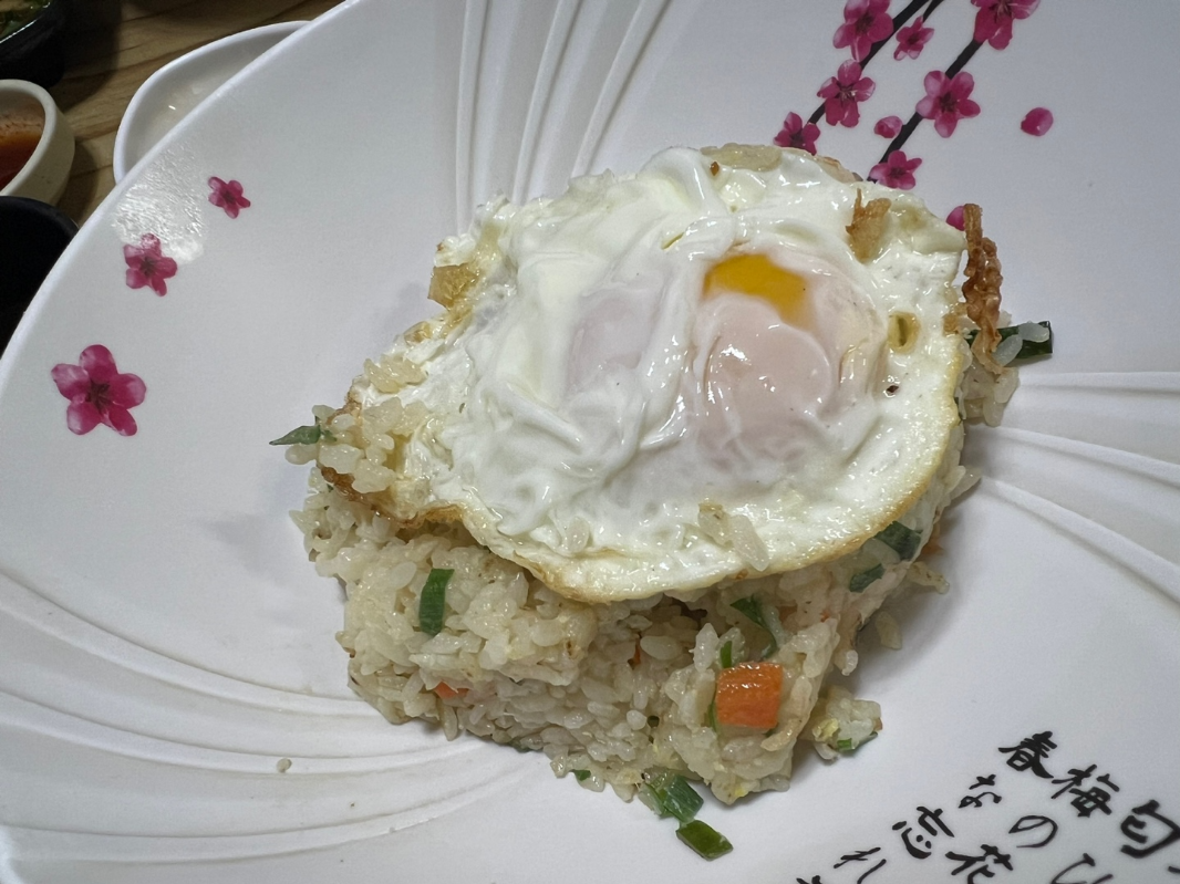 볶음밥에는 반숙계란이 먹음직스럽게 올려져 있어요.