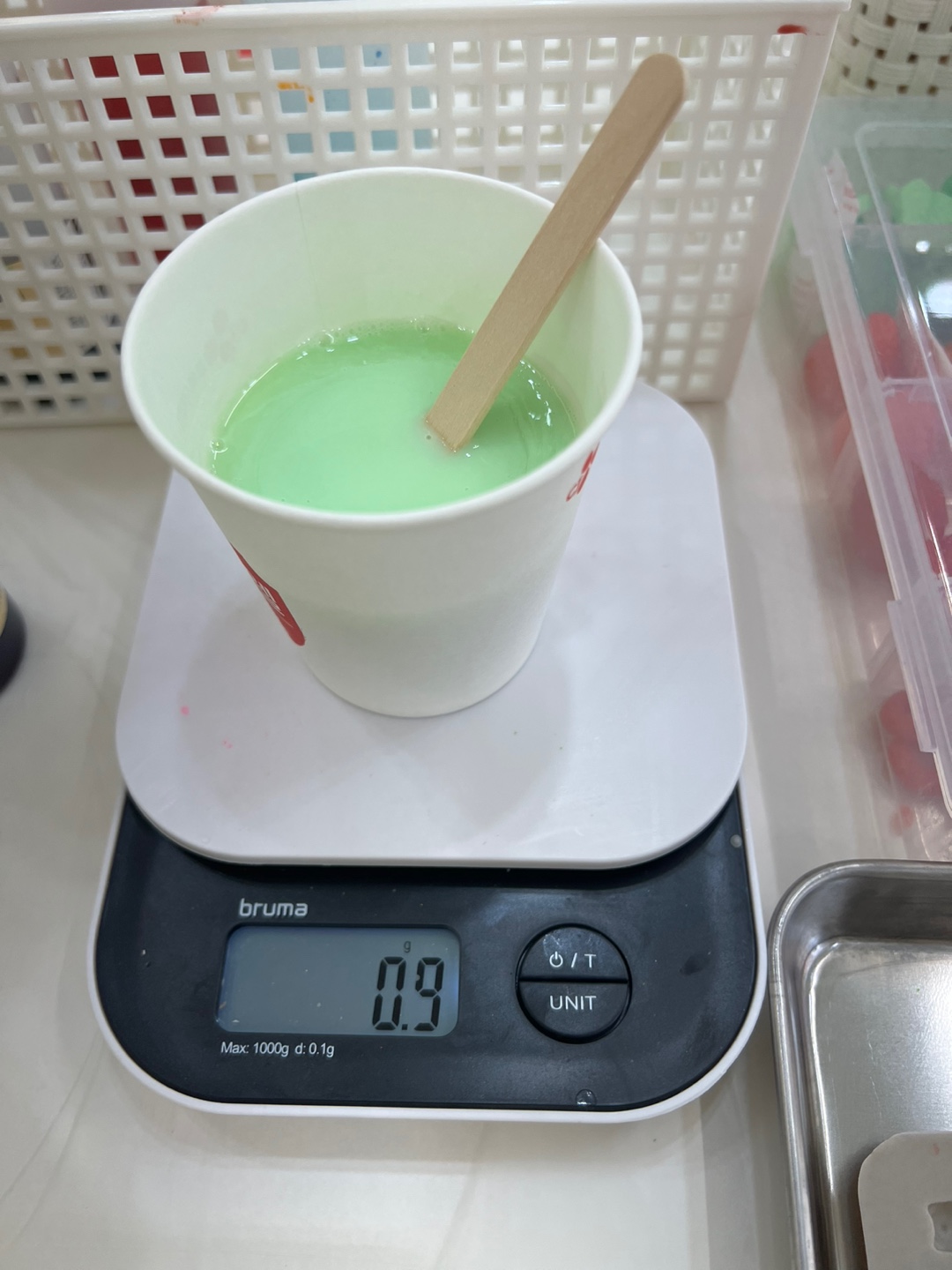 어떤 틀에 투명한 비누와 불투명한 비누를 넣을지 정한 후, 선생님께서 알려주시는 대로 오일과 글리세린을 넣고 잘 섞어줬어요.