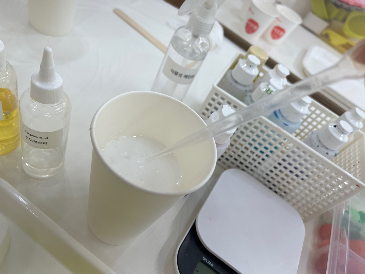 프래그런스 오일 향과 귀여운 비누 틀을 선택한 후 비누 만들기 수업을 본격적으로 시작했어요.