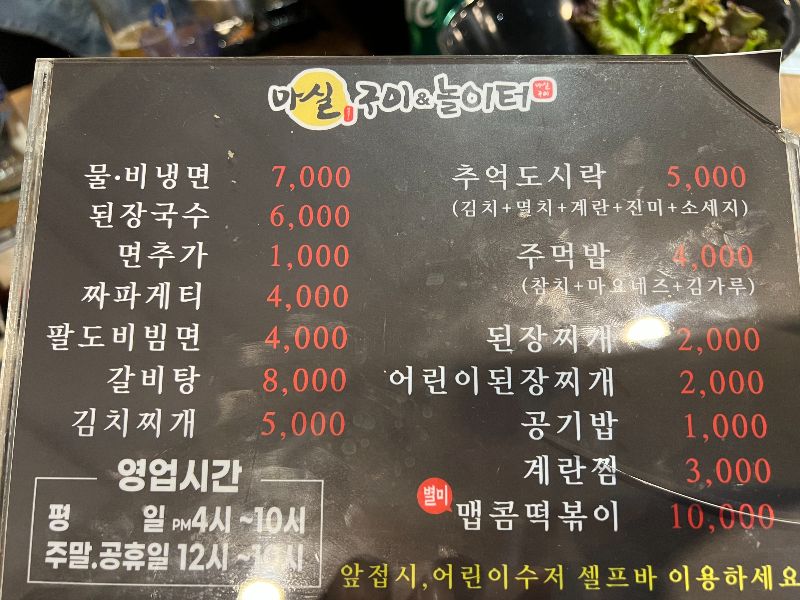 놀이방 덕분에 여유롭게 저녁을 먹었으니 짜파게티 두 그릇에 8천 원.. 쿨하게 주문했어요. 하하하...