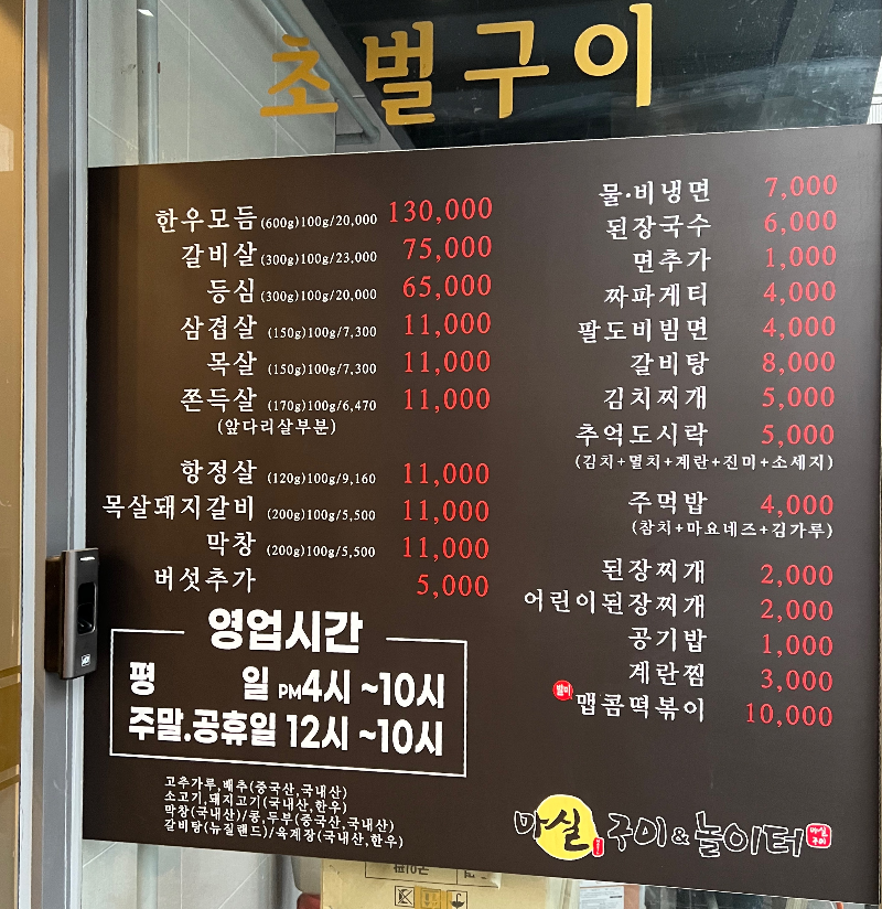 들어가기 전 문에 메뉴와 가격표가 붙어 있어요.