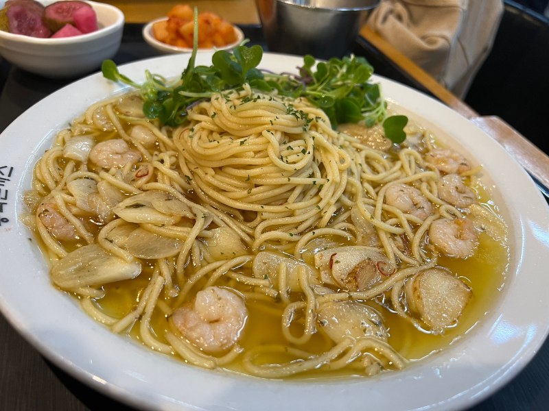 홍익돈가스와 함께 꼭 시켜 먹는 알리오올리오 파스타예요.