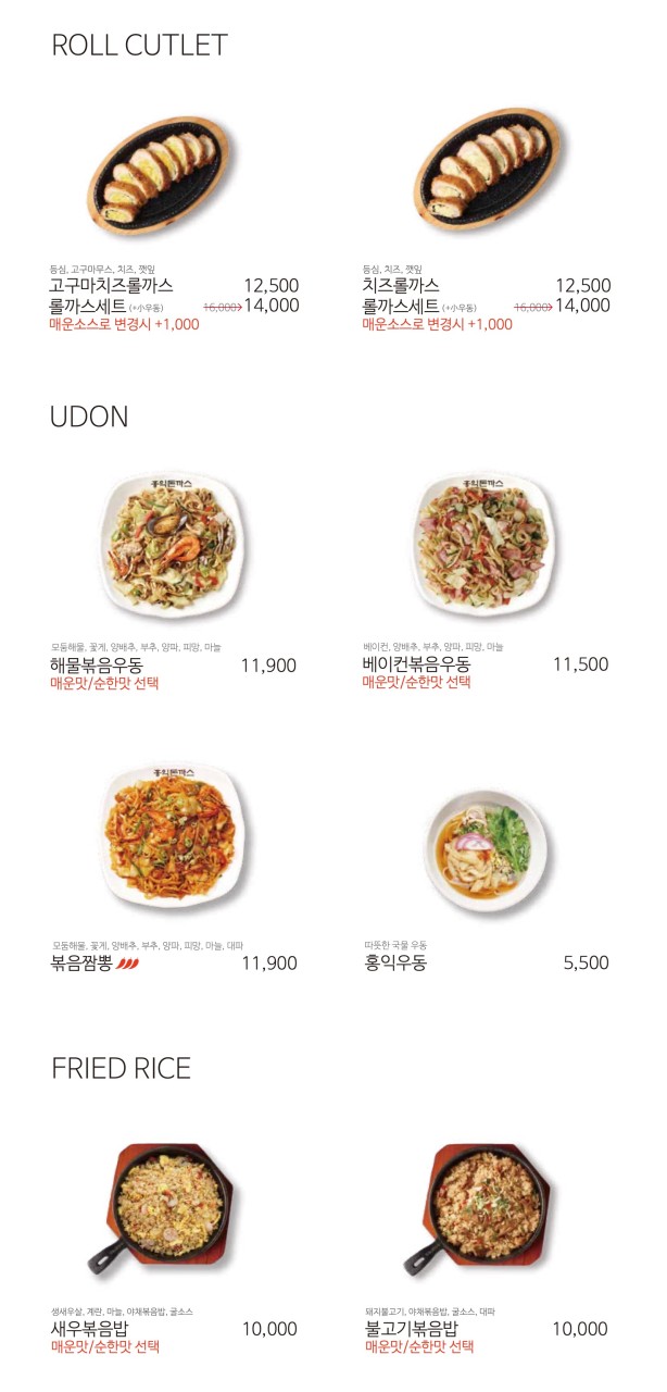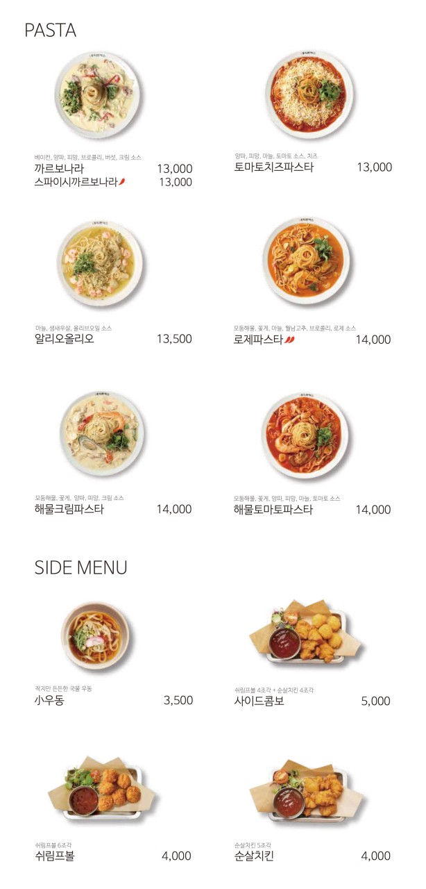 돈가스, 우동, 볶음밥, 파스타, 사이드 메뉴가 다양하게 있어요.