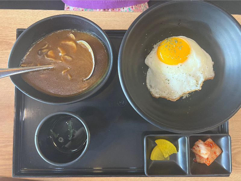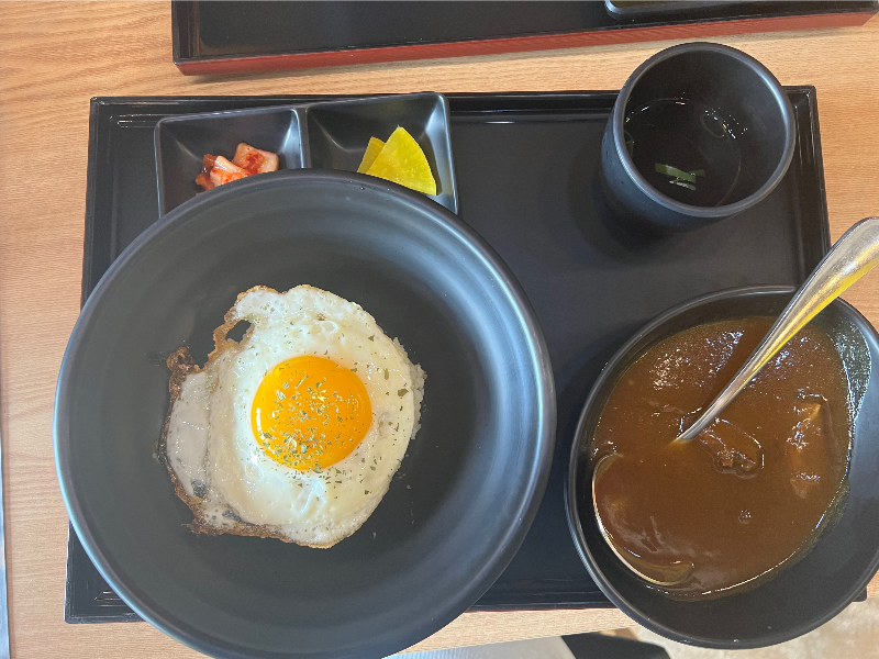 마찬가지로 반숙 계란프라이가 밥 위에 올려져 있어요.