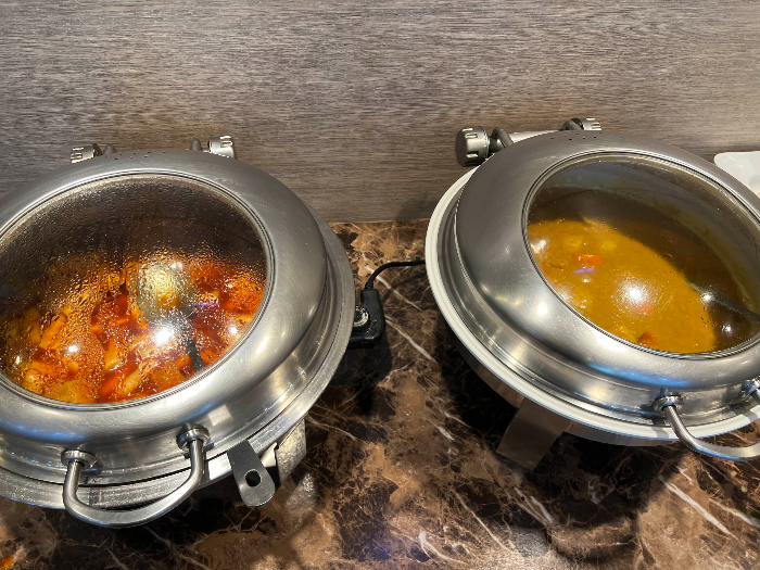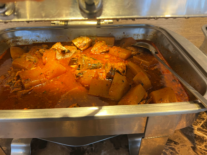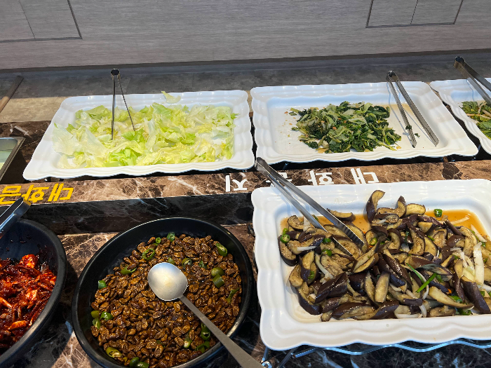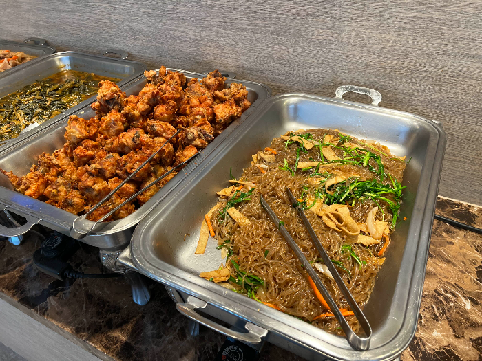 일렬로 쭉 늘어져 있는 음식들의 가짓수가 상당히 많아 보여요.