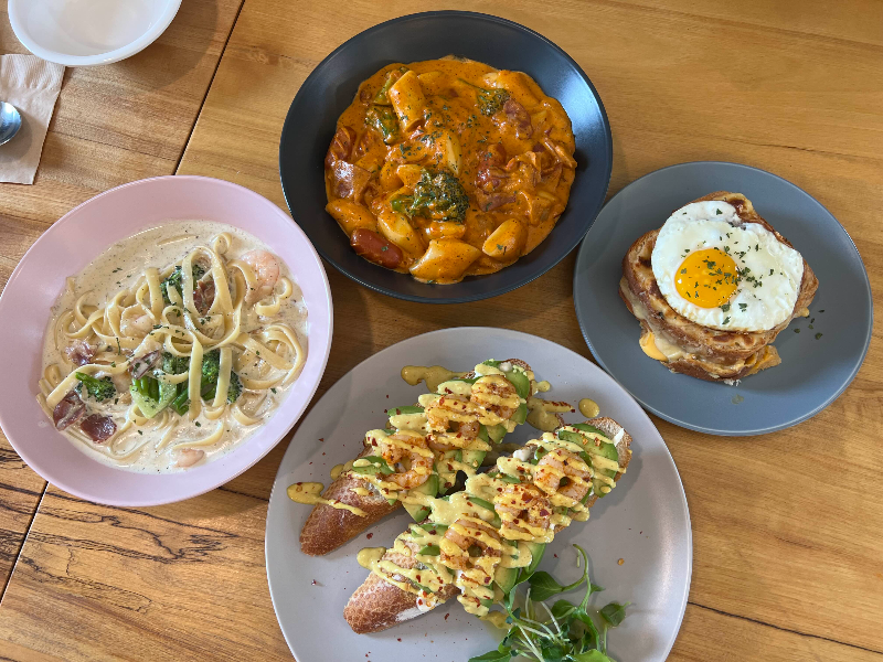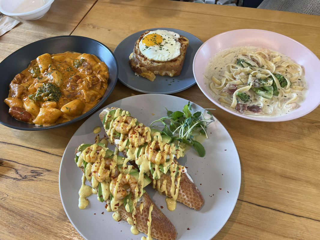 파스타, 떡볶이, 오픈 샌드위치, 토스트, 디저트 종류와 커피, 차, 수제 과일차, 수제 에이드, 생과일 주스가 있어요.