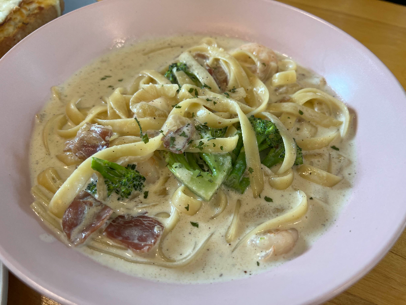 까르보나라 파스타는 까르보나라에 페투치니 면으로 소스가 한 데 잘 어우러져 든든하게 채울 수 있는 한 끼 파스타.