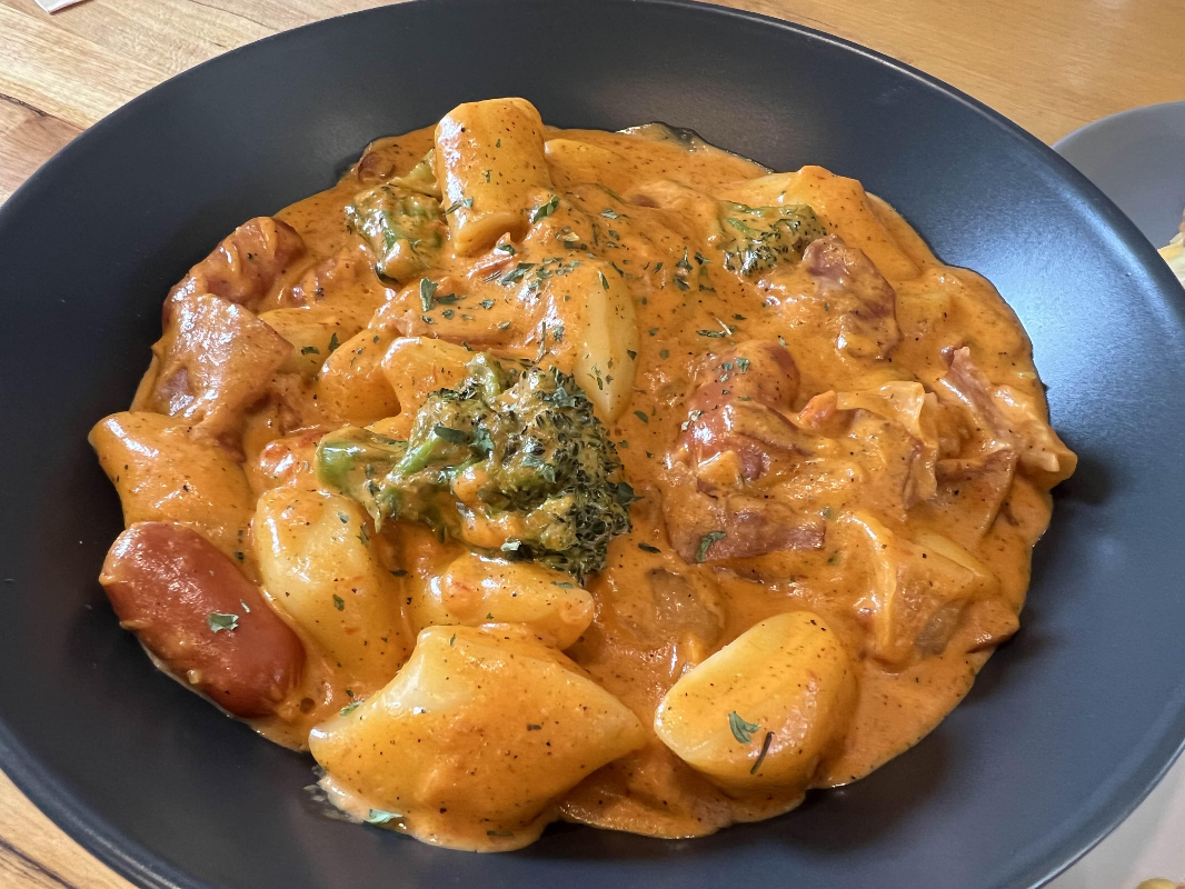 로제 소시지 떡볶이는 토마토와 생크림이 만난 로제 소스에 통실한 비엔나소시지와 쫀득한 떡의 조화.