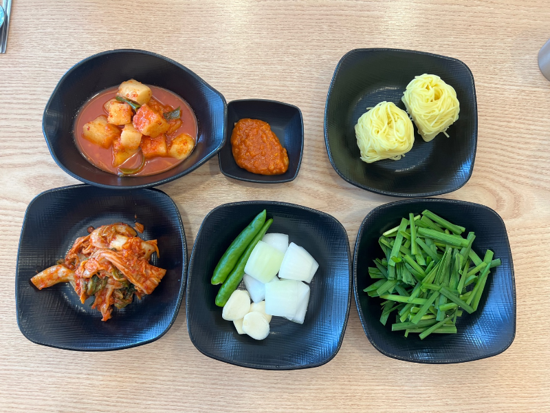 밑반찬으로 깍두기와 김치, 고추, 양파, 마늘, 쌈장, 부추, 소면 사리가 나와요.