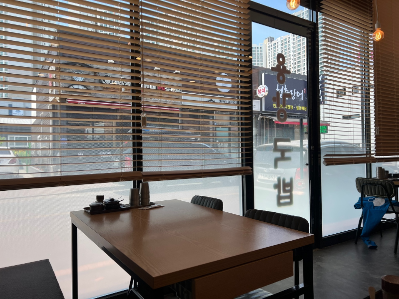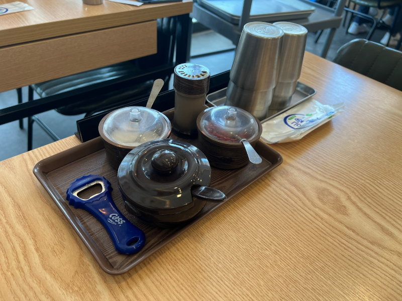 수저는 테이블 아래에 서랍형으로 구비되어 있고 다진 양념, 소금, 후추, 새우젓이 놓여있어요.