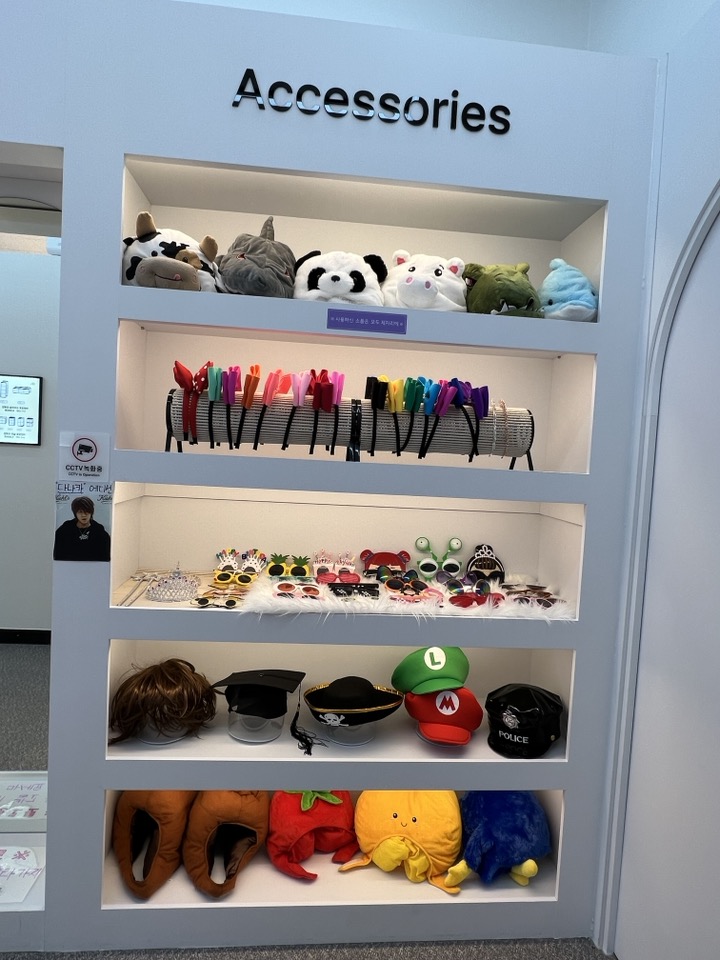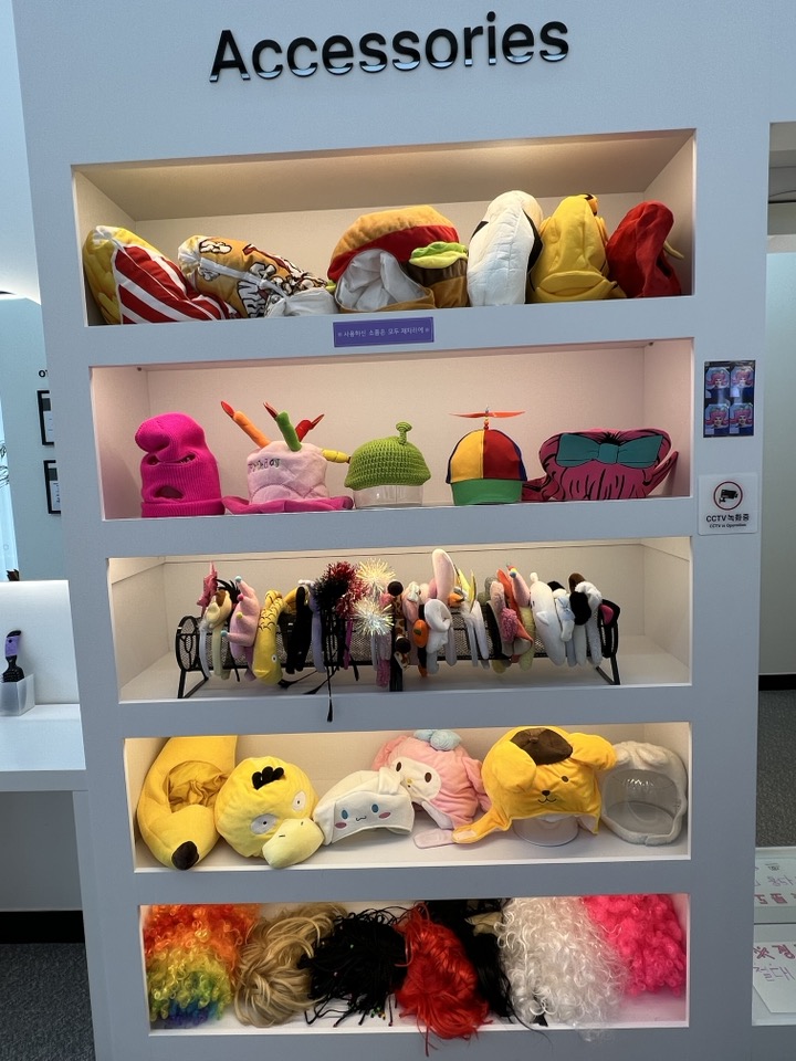 각종 머리띠와 모자, 안경, 선글라스, 가발이 준비되어 있어요.