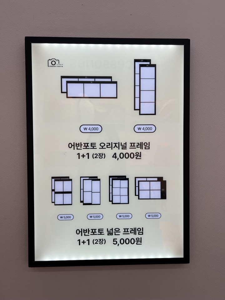 가장 기본적인 세로 네 컷 프레임은 4천 원이에요.
