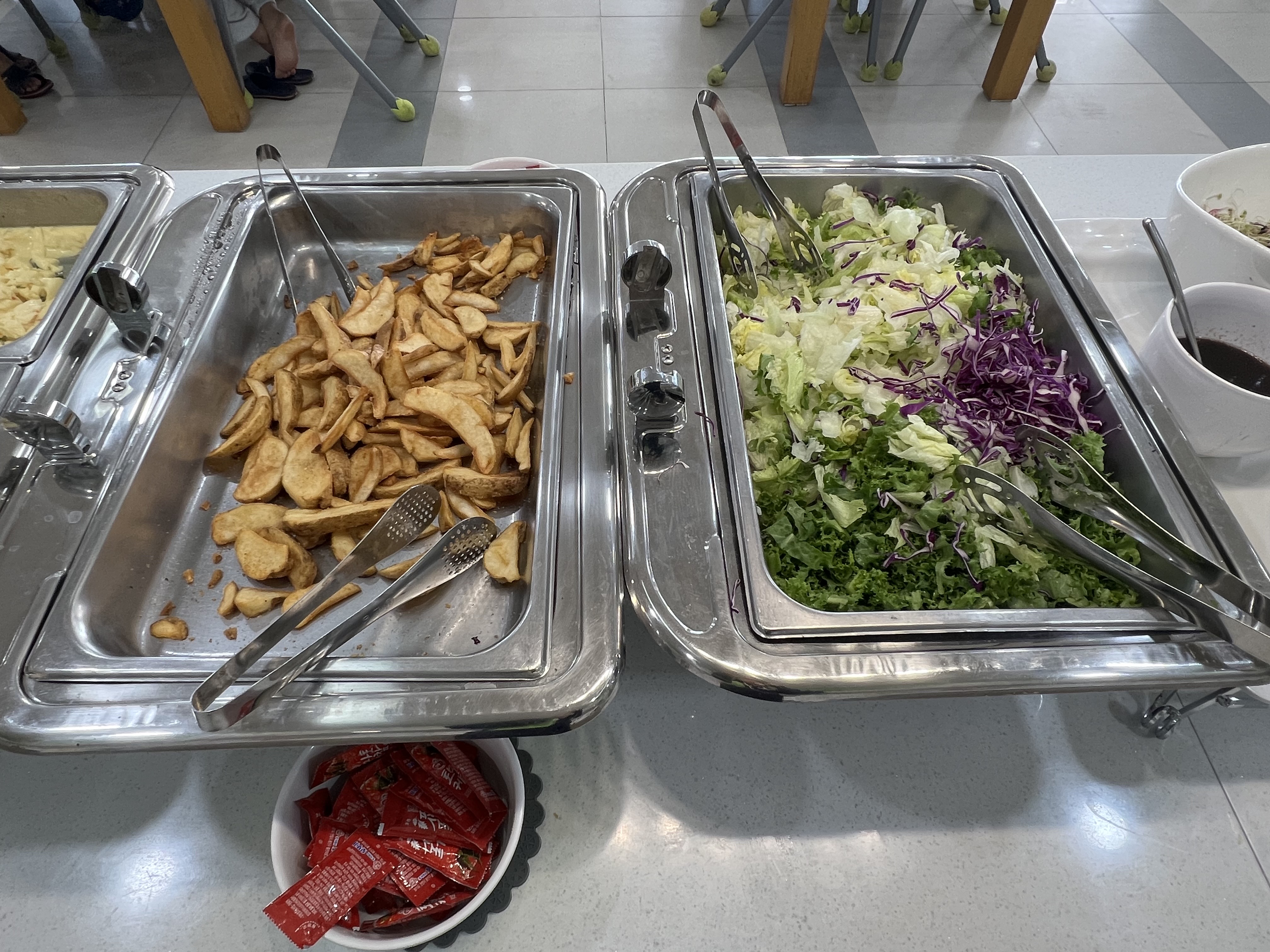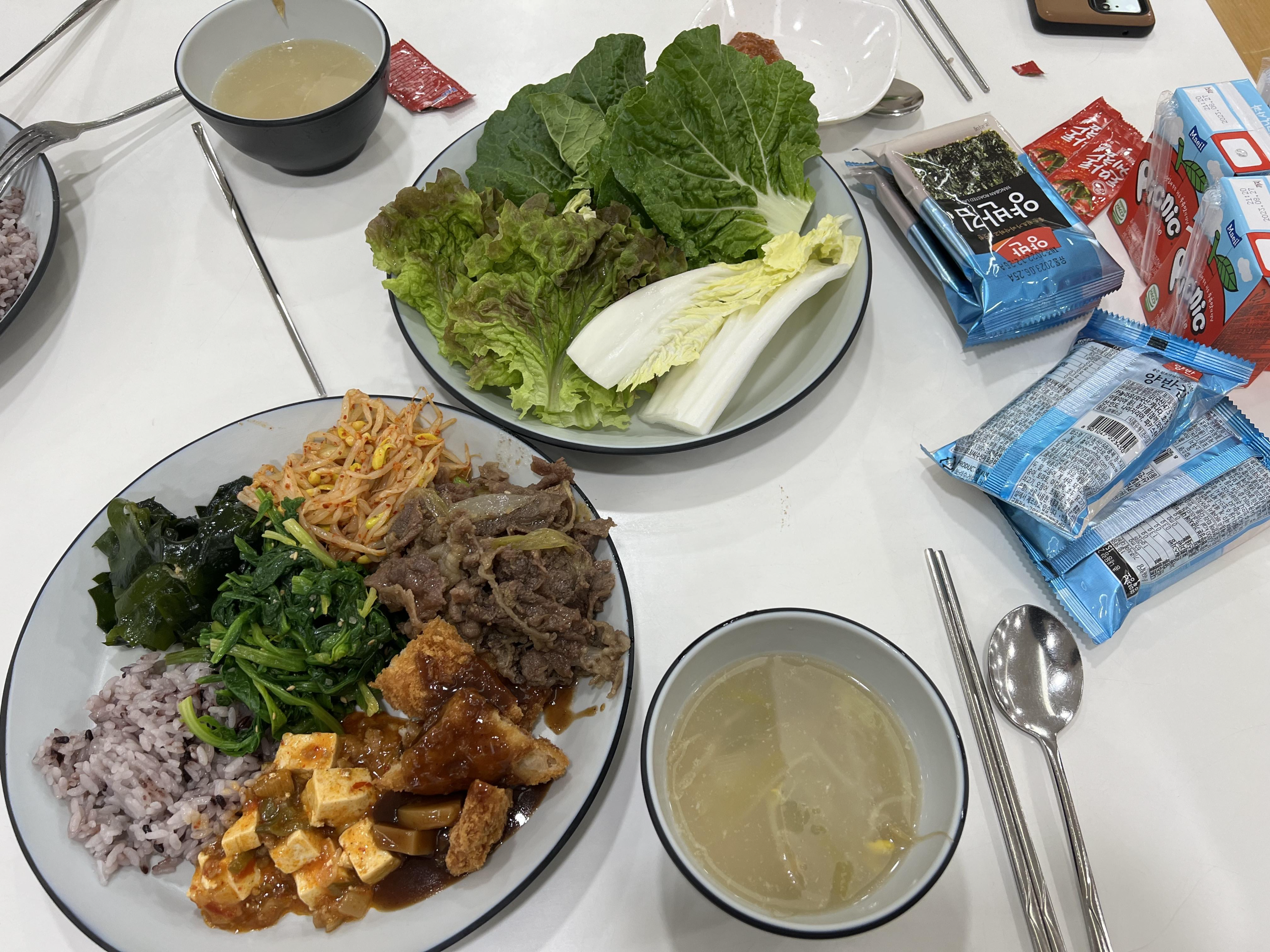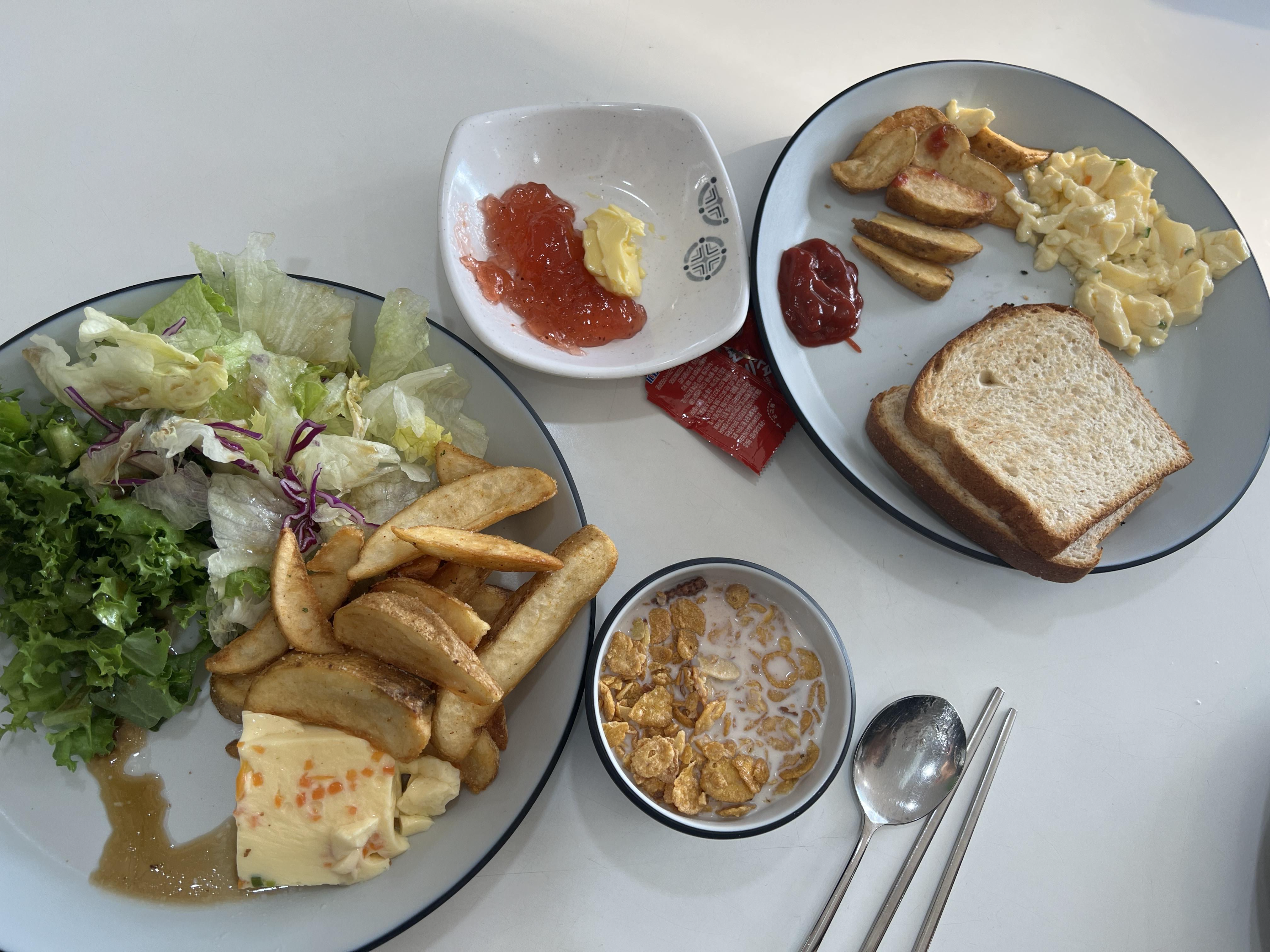 조식은 밥과 국, 반찬도 있고 간단히 먹을 수 있는 빵, 우유, 시리얼, 샐러드, 감자튀김이 있었어요.