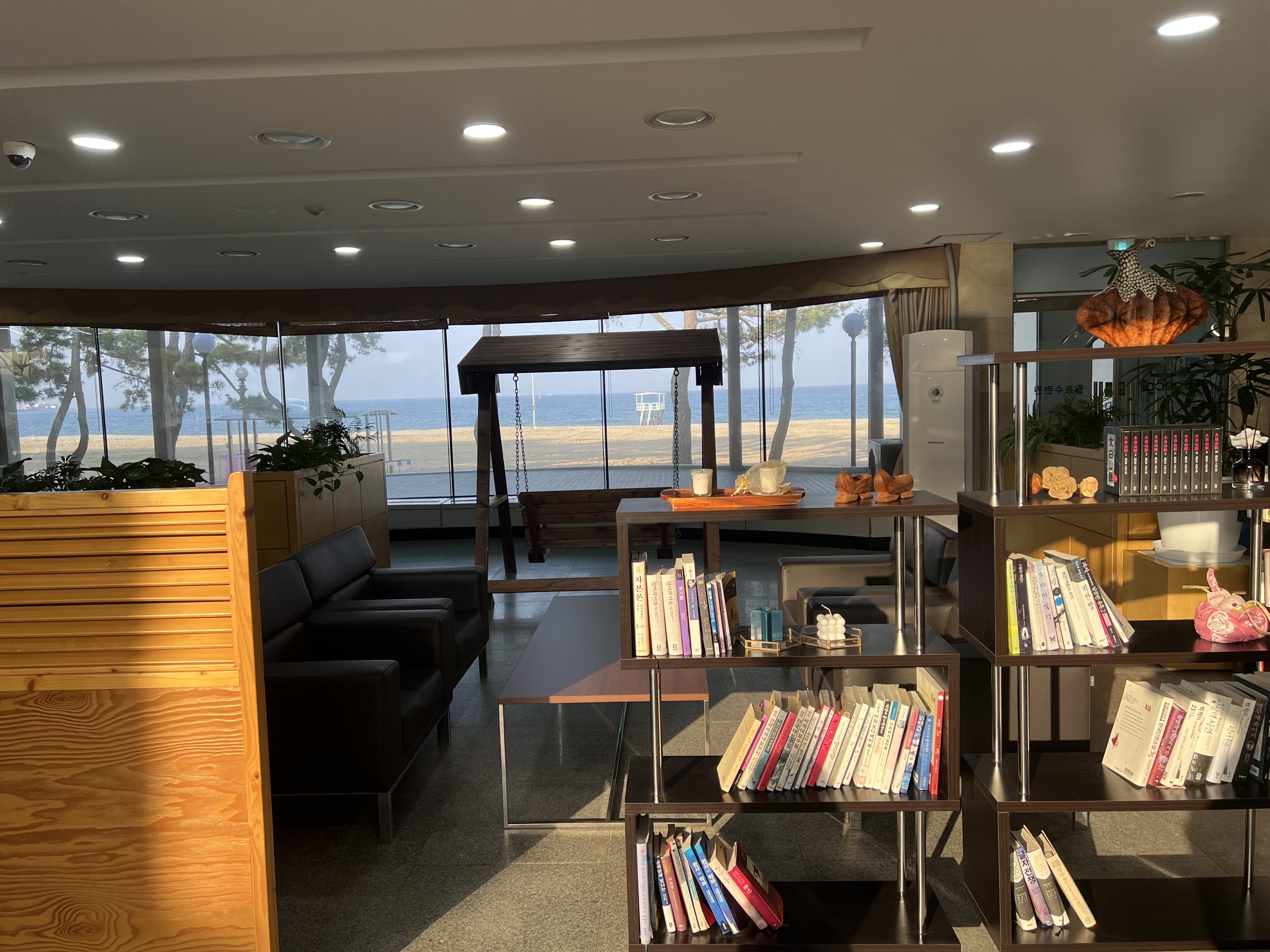 바다가 훤히 보이는 휴게실에 흔들 그네와 책도 구비되어 있어요.