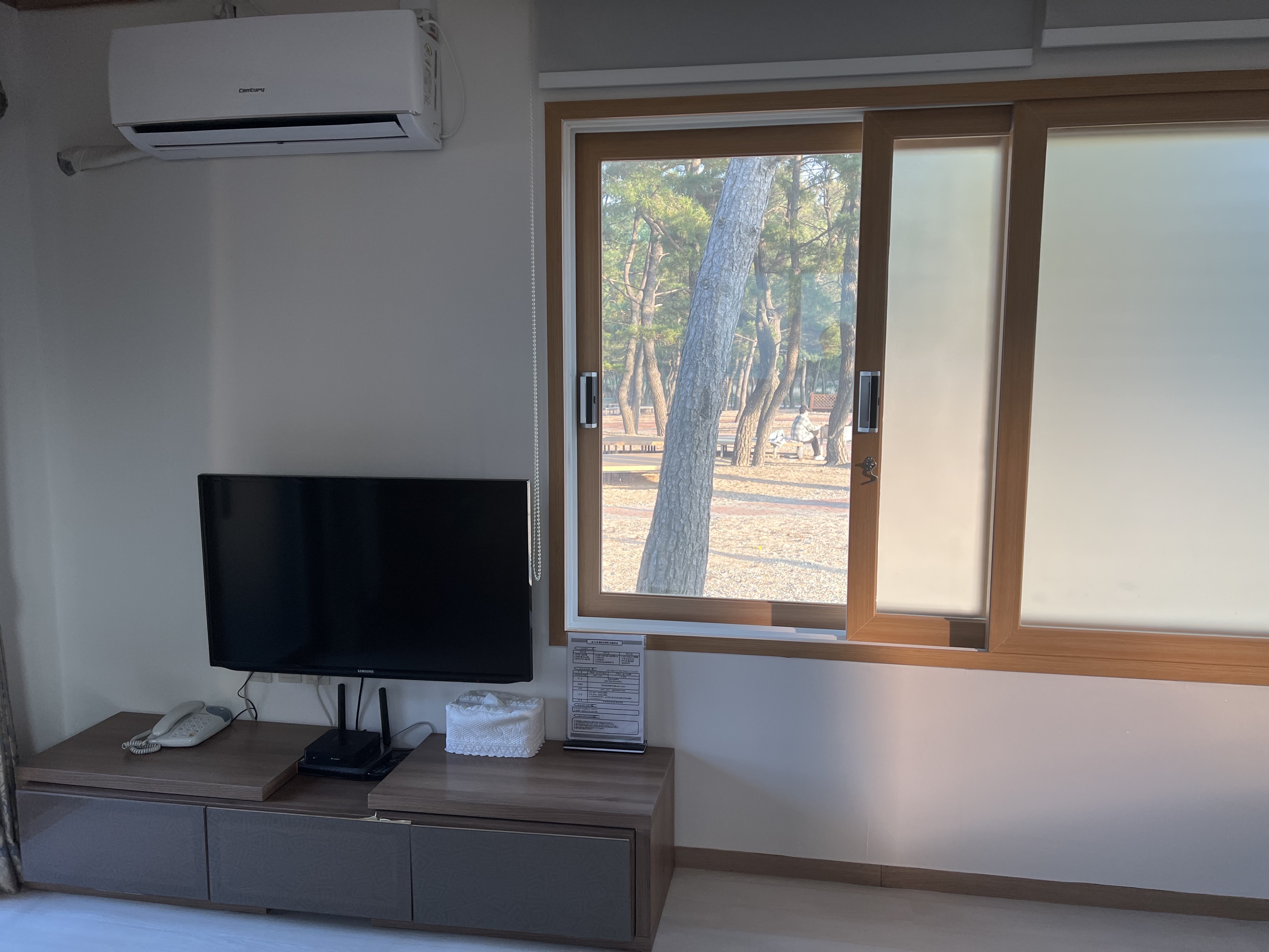 TV와 작은 냉장고, 에어컨이 있어요.