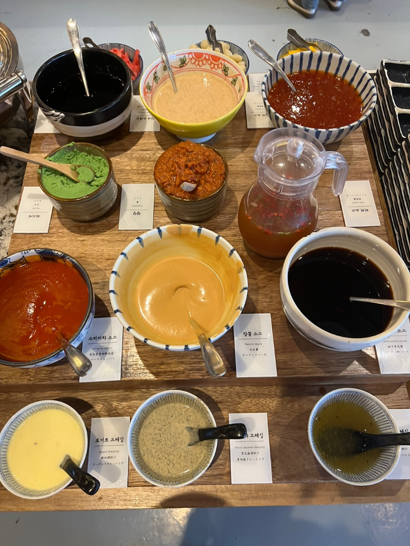 와사비, 쌈장, 피쉬소스, 칠리소스, 참깨드레싱, 스리라차 소스, 땅콩 소스, 요거트 드레싱, 흑임자 드레싱, 유자 드레싱 등..