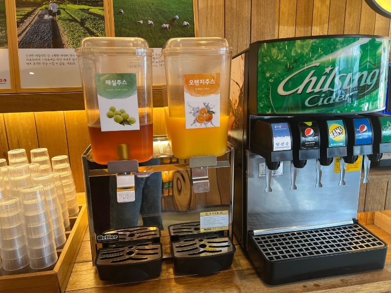 싱싱한 야채들이 있는 야채텃밭 코너와 그 옆으로 매실주스와 오렌지주스, 탄산음료가 있어요.