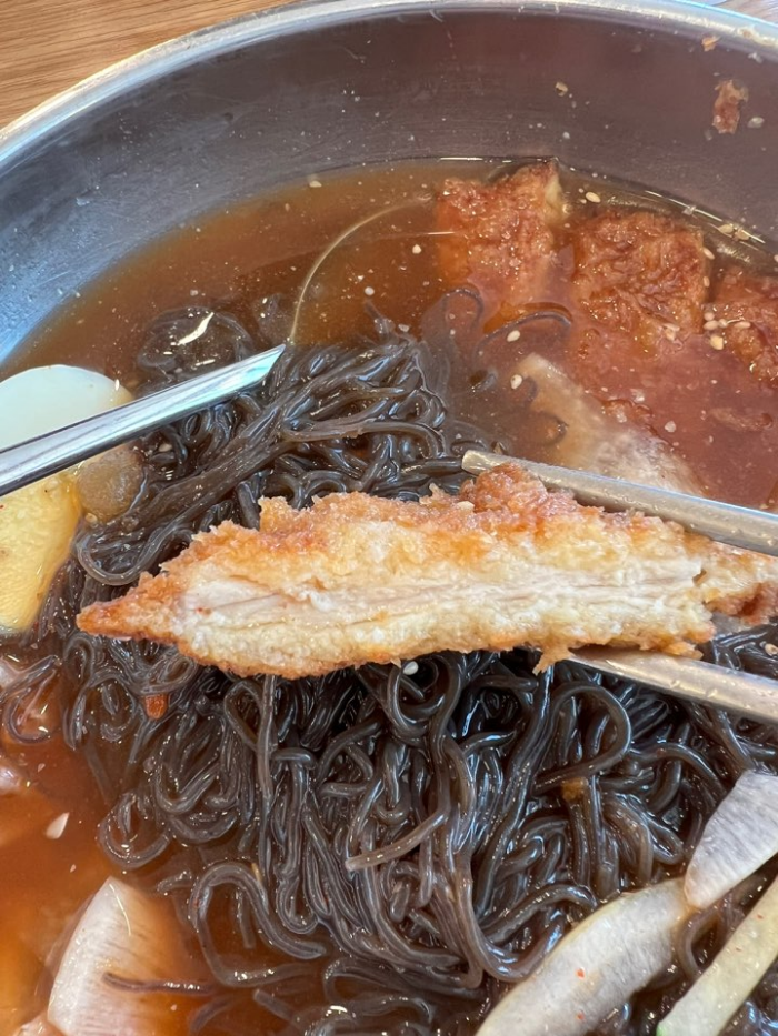 냉면 속에 들어간 돈가스를 먹는대도 바삭바삭해요.