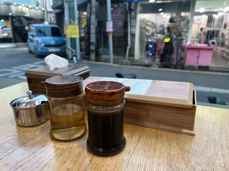 간장과 고춧가루, 식초가 테이블마다 있어요.