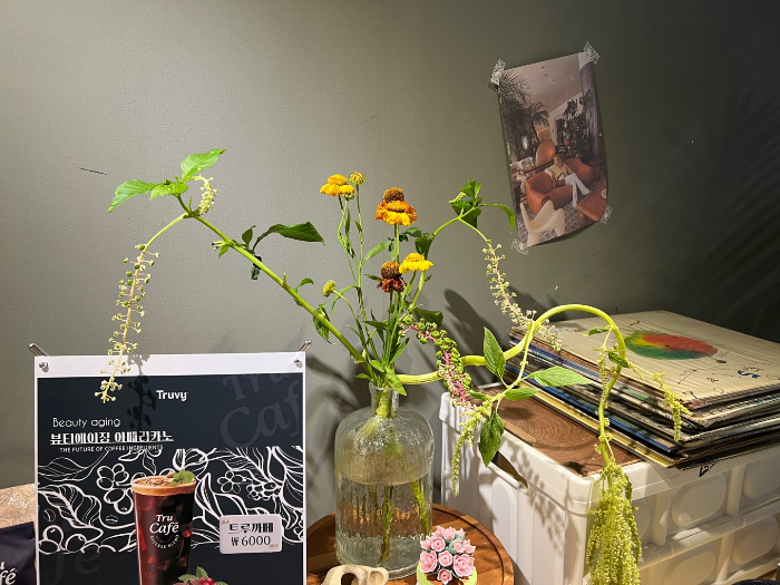 싱그러움이 가득 풍겨졌는데 초록잎의 나무들과 테이블마다 다른 종류의 생화가 예쁘게 놓여있지 뭐예요.