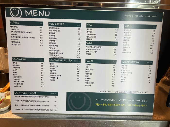 메뉴판을 보시면 커피와 논커피, 티, 샌드위치, 샐러드, 사이드 메뉴 등이 있는데요.