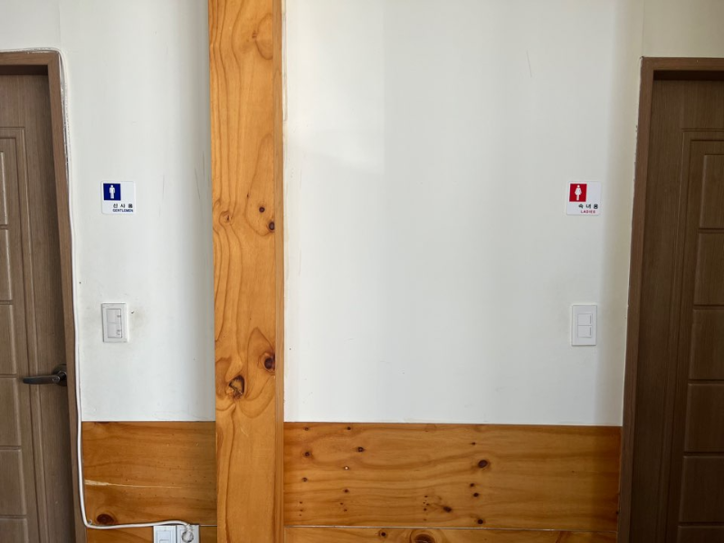 가게 내부에 남, 여 화장실이 있고 테이블마다 수저통과 티슈통이 놓여 있어요.