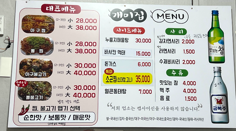 메뉴는 아귀찜, 뽈찜, 아구불고기, 뽈불고기가 있는데 거의 모든 사람이 뽈불고기를 먹지 않을까 싶어요.