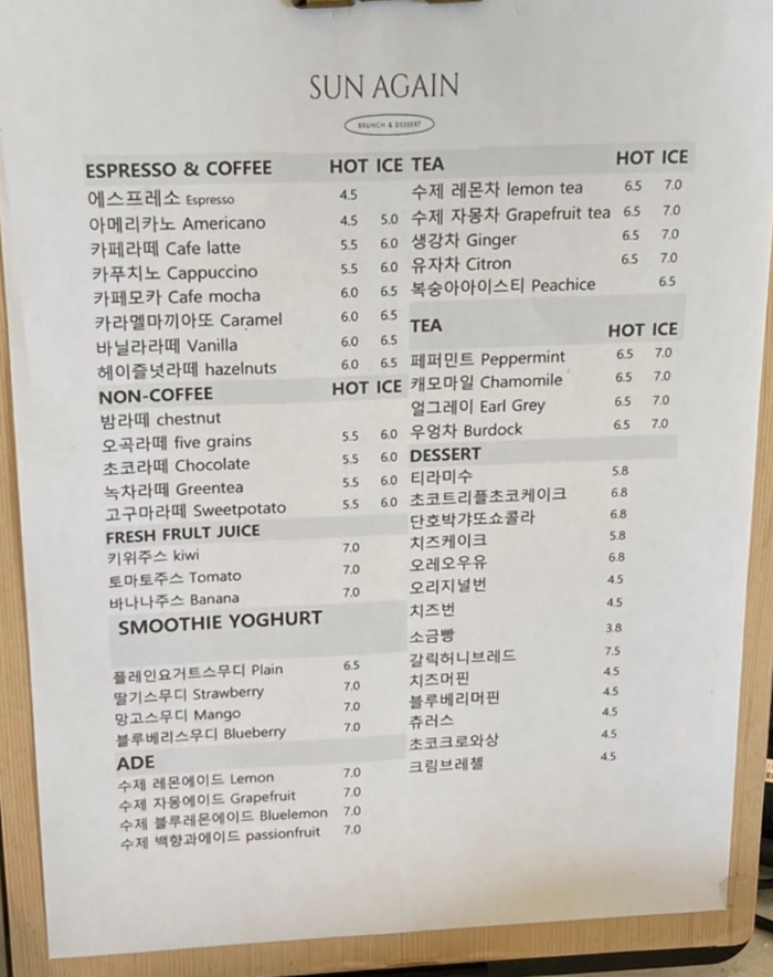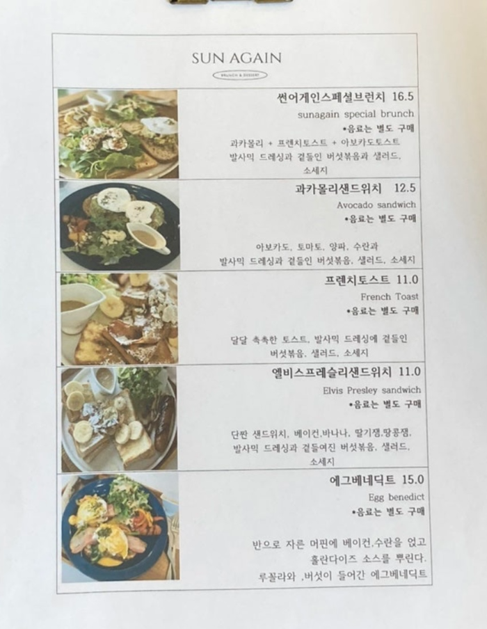 포항 죽천 바다뷰 브런치 카페_ 썬어게인 메뉴