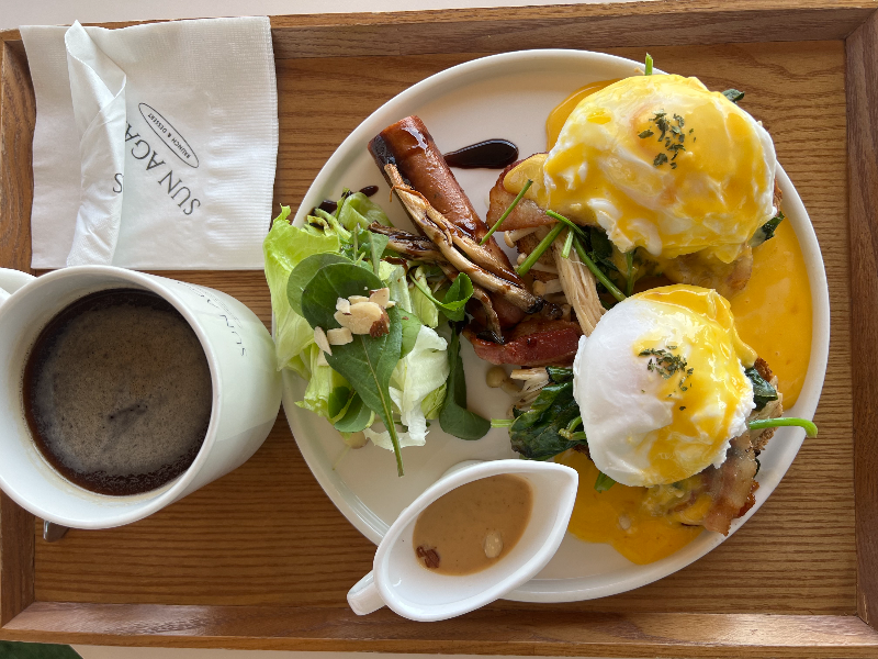 아메리카노 2잔과 썬어게인 브런치, 에그베네딕트를 주문했어요.