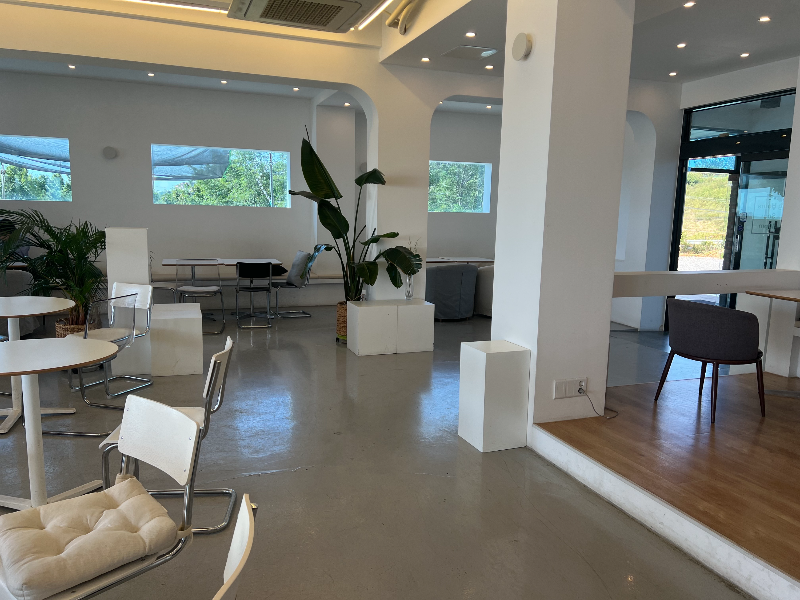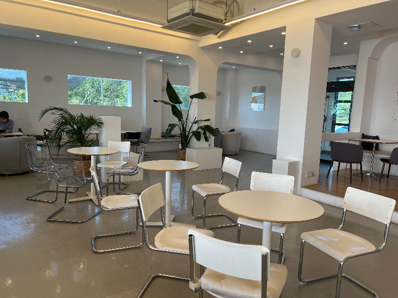 들어가니 깔끔한 실내공간과 야외테이블이 함께있는 아주 탁트인 공간이 보여요.