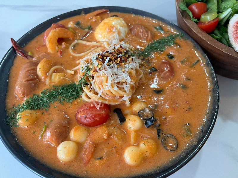 동글동글 눈사람 모양의 떡볶이가 들어있는 매콤한 로제 파스타.
