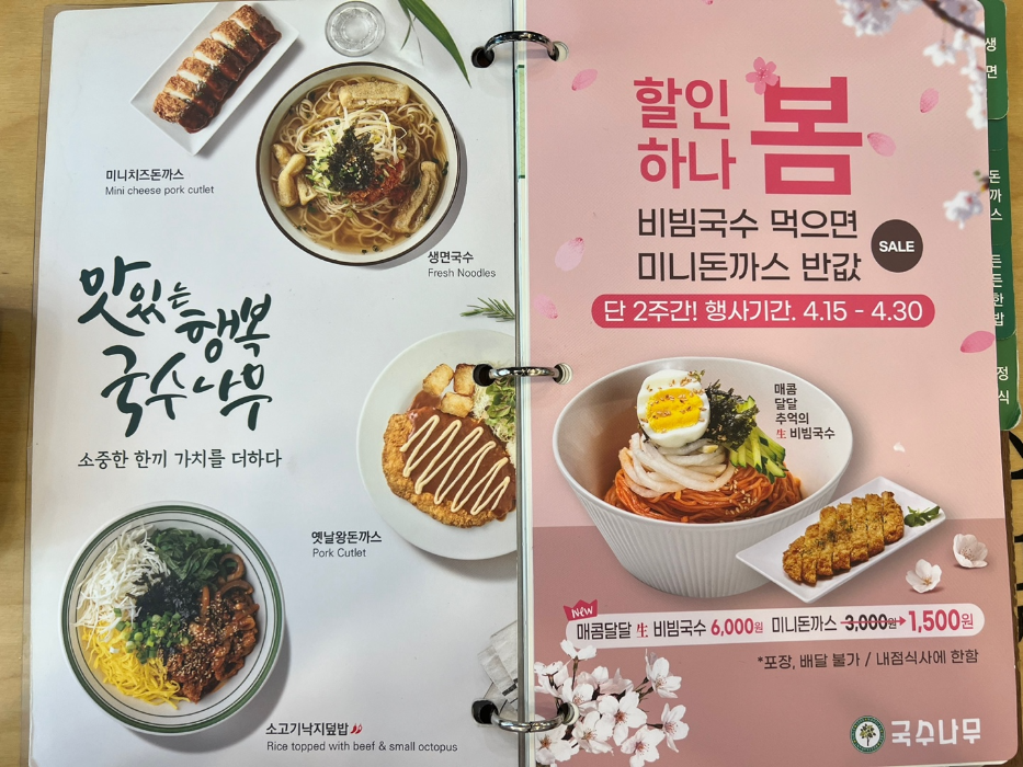원래는 돈까스 먹으러 다른 곳에 가기로 했는데 그 식당이 휴무라 고민하다 집과 가까운 국수나무에 갔어요.