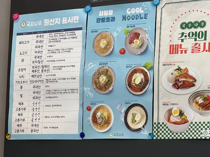 국수나무 원산지 표시판과 메뉴 포스터가 보기 좋게 벽면에 붙어져 있어요.