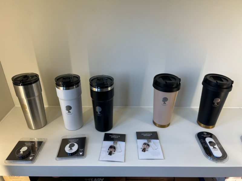 텀블러와 머그잔도 진열장에 판매하고 있어요.