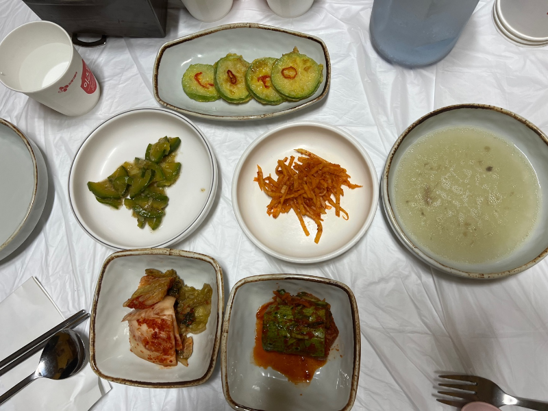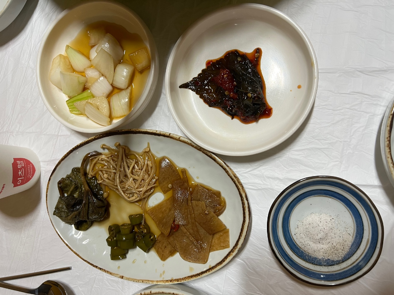 밑반찬으로 깻잎, 양파지와 장아찌 종류, 애호박 볶음, 애호박 전, 김치, 오이소박이, 무생채가 나왔어요.