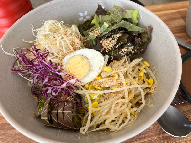 쫄면에는 달걀 반 개, 깻잎, 적양상추, 양상추, 상추, 콩나물이 들어있어요.