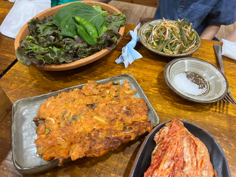 가장자리가 노릇노릇하게 굽힌 김치전도 짜지 않고 맛있어서 한번 더 리필해 먹었어요.