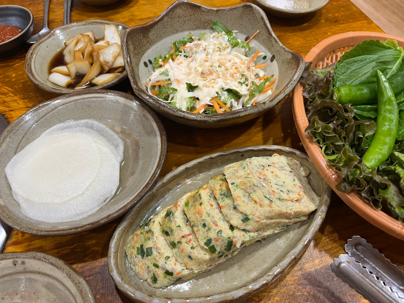 샐러드, 계란말이, 김치전, 김치, 양파지, 쌈무, 깻잎, 상추, 고추, 마늘, 쌈장, 파재래기, 소금이 나와요.
