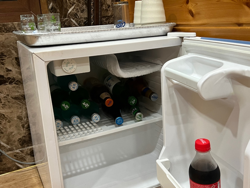 냉장고 안에는 소주, 맥주, 콜라, 사이다, 환타가 골고루 준비되어 있어요.